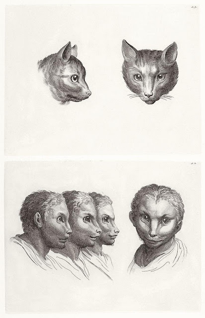 Charles le Brun cca 1670 (engraving from 1809). “Deux têtes de chat et quatre têtes d’hommes en relation avec le chat.” |